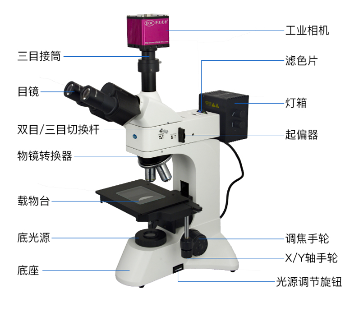 顯微鏡的結(jié)構(gòu)基本結(jié)構(gòu),包括工業(yè)相機(jī)、目鏡、物鏡、載物臺、轉(zhuǎn)換器、光源。當(dāng)然其實(shí)整體的結(jié)構(gòu)遠(yuǎn)遠(yuǎn)多于上述核心部件。