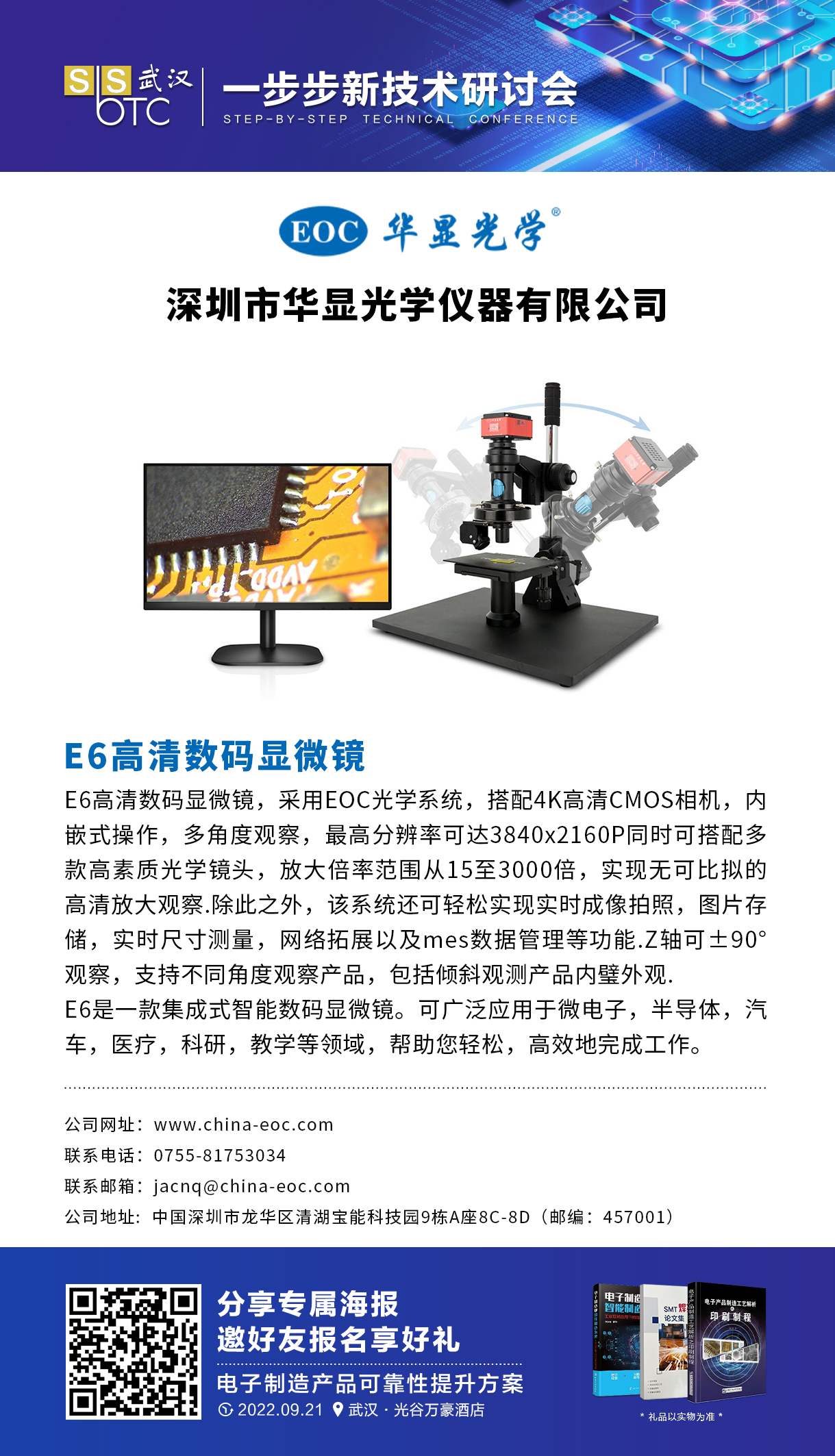 深圳市華顯光學儀器有限公司誠摯地邀請您參加下周三 《智電子制造產(chǎn)品可靠性提升方案》為主題,在武漢.光谷萬豪酒店進行的一步步新技術(shù)研討會。