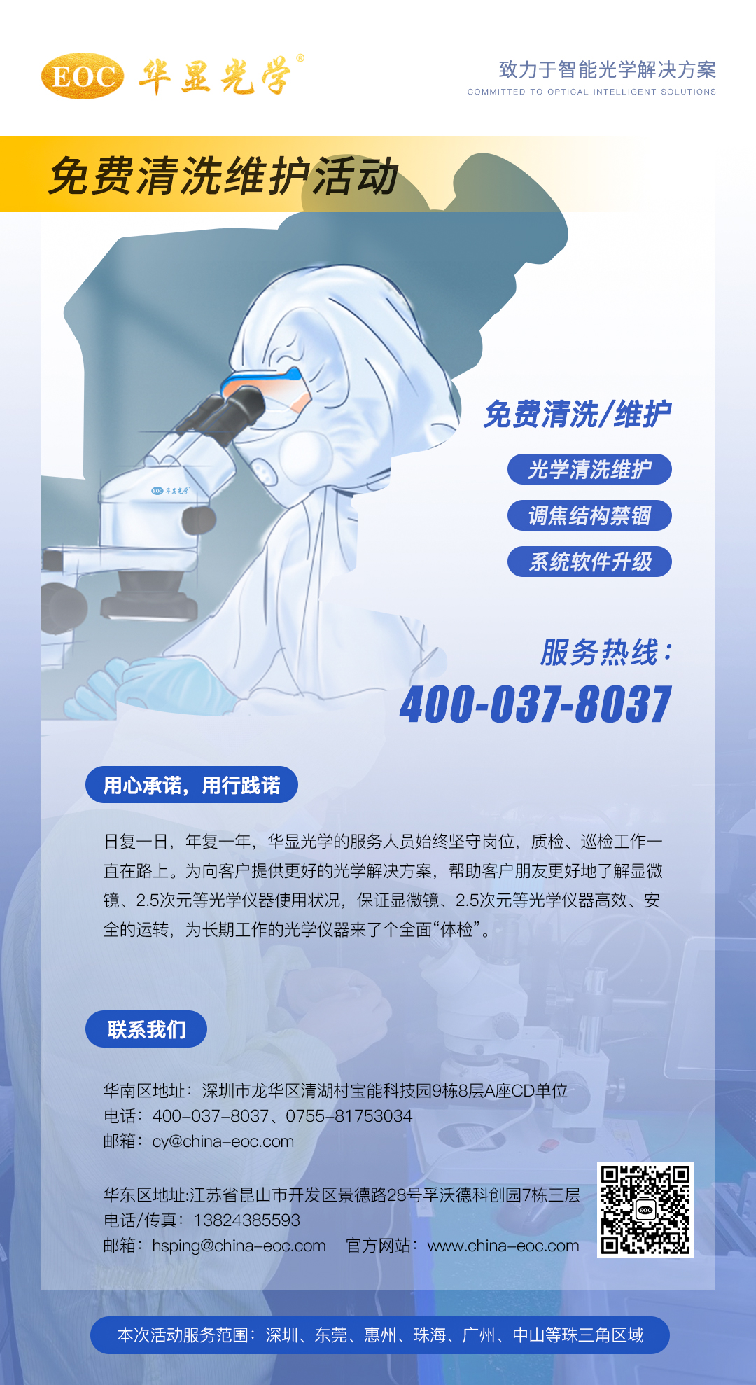2023年華顯光學(xué)年度免費(fèi)清洗保養(yǎng)服務(wù)已開啟預(yù)約。凡購買我司產(chǎn)品,工程師將每年進(jìn)行免費(fèi)上門清洗調(diào)校。此項服務(wù)不僅能夠預(yù)防顯微鏡、測量儀器等產(chǎn)品在使用中遇到的異常現(xiàn)象,而且定期維護(hù)有助于提高顯微鏡的使用壽命。