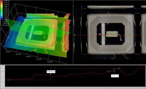 LED芯片封裝完成后,需要測(cè)量有無溢膠、金線、焊盤高度有無超出標(biāo)準(zhǔn)值,我們可以利用超景深顯微鏡的三D建模、維彩圖功能,一鍵式測(cè)量出產(chǎn)品高度。邦定焊盤的高度、膠水厚度、弧高等都能夠精準(zhǔn)量測(cè)。