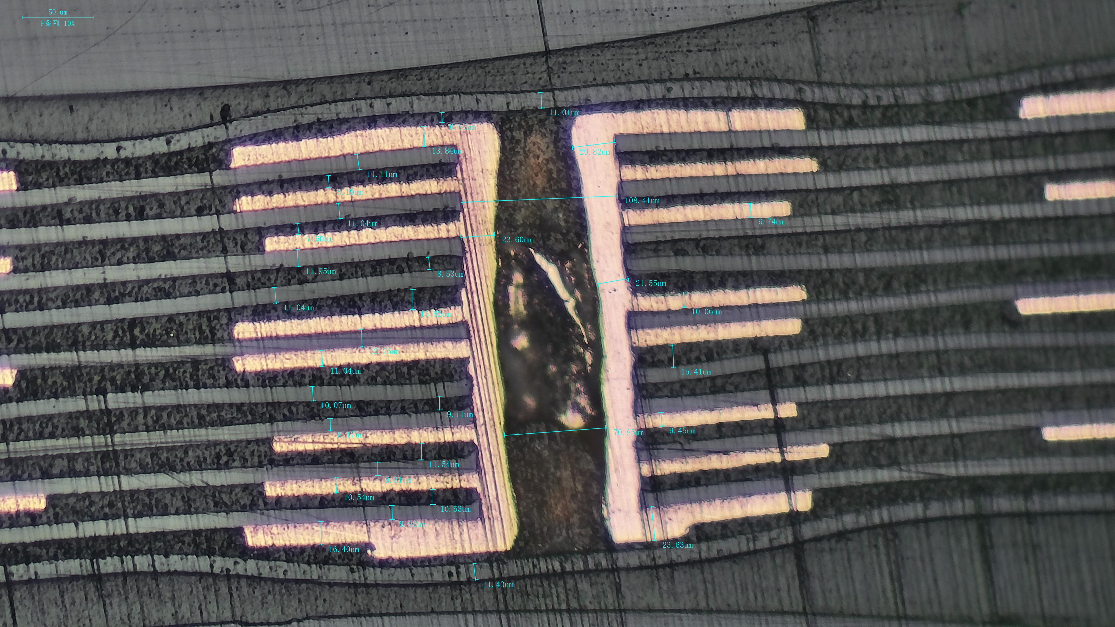 使用金相顯微測(cè)厚儀、圖像分析軟件(如EOC測(cè)量軟件)對(duì)關(guān)鍵尺寸(銅箔寬窄、油墨厚度、線路間距)進(jìn)行量化測(cè)量,對(duì)比IPC-A-6012等標(biāo)準(zhǔn)。