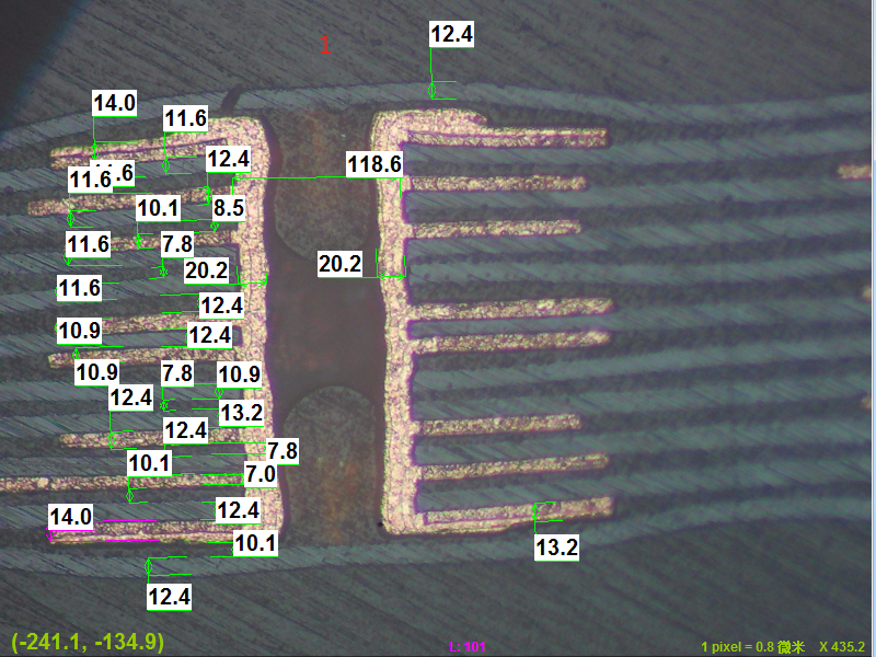 ● 線路寬窄公差(如設(shè)計(jì)值±5μm內(nèi)的控制能力)、銅箔厚度均勻性(通過圖像中不同區(qū)域的灰度差異輔助判斷)、油墨覆蓋焊盤的最小邊緣間距(需精確到1μm級(jí))等關(guān)鍵參數(shù),均依賴清晰圖像結(jié)合標(biāo)尺或顯微測(cè)微尺進(jìn)行測(cè)量。