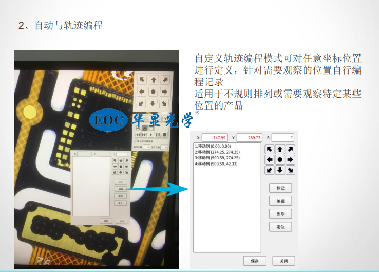 三、系統(tǒng)硬件(主要配件) l 200萬(wàn)高清HDMI智能相機(jī),無(wú)需PC,具備編程記錄軌跡功能;帶網(wǎng)口傳輸(選配) l 配置EOC光學(xué)鏡頭; l 電動(dòng)位移平臺(tái),行程300*300; 可定制更大行程; l LED光源; l 21.5寸品牌顯示器;