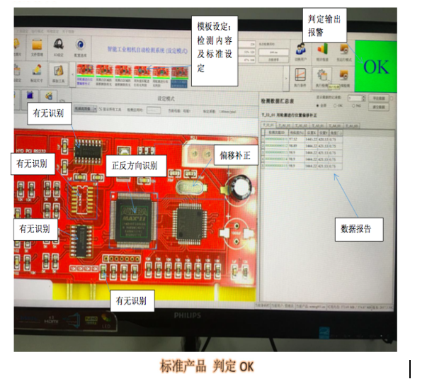 通過智能工業(yè)相機。對PCBA產品進行元器件有無,正反,進行定向識別檢測;多工位實時檢測,檢測結果通過數(shù)據(jù)互聯(lián)上傳至系統(tǒng)管理軟件。