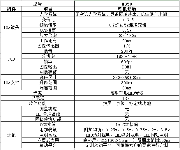 無窮遠(yuǎn)光學(xué)系統(tǒng),變倍比1:6.5,物鏡變倍范圍0.7x~4.5x,標(biāo)準(zhǔn)工作距離90mm;