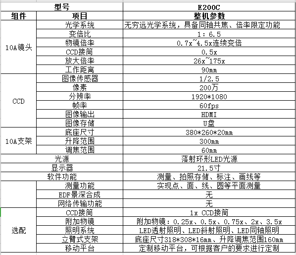 無窮遠(yuǎn)光學(xué)系統(tǒng),變倍比1:6.5,物鏡變倍范圍0.7x~4.5x,標(biāo)準(zhǔn)工作距離90mm;