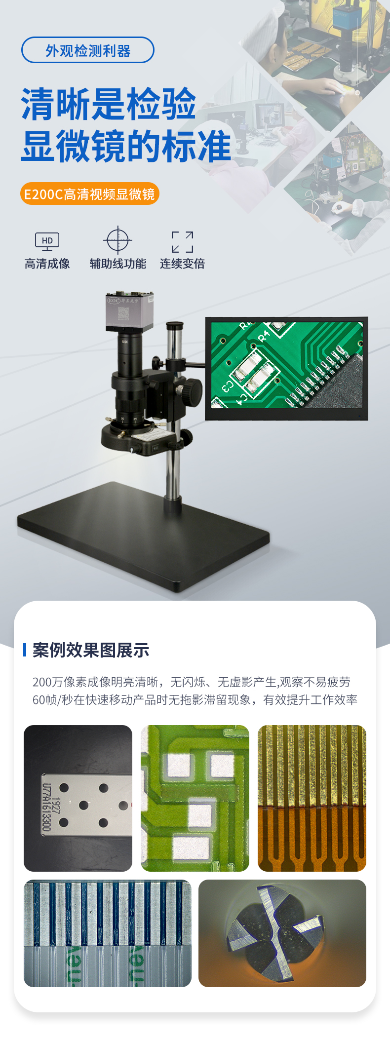 E200C視頻顯微鏡采用無窮遠(yuǎn)光學(xué)系統(tǒng),該系列配備高景深、高物距鏡頭、高清工業(yè)相機(jī),