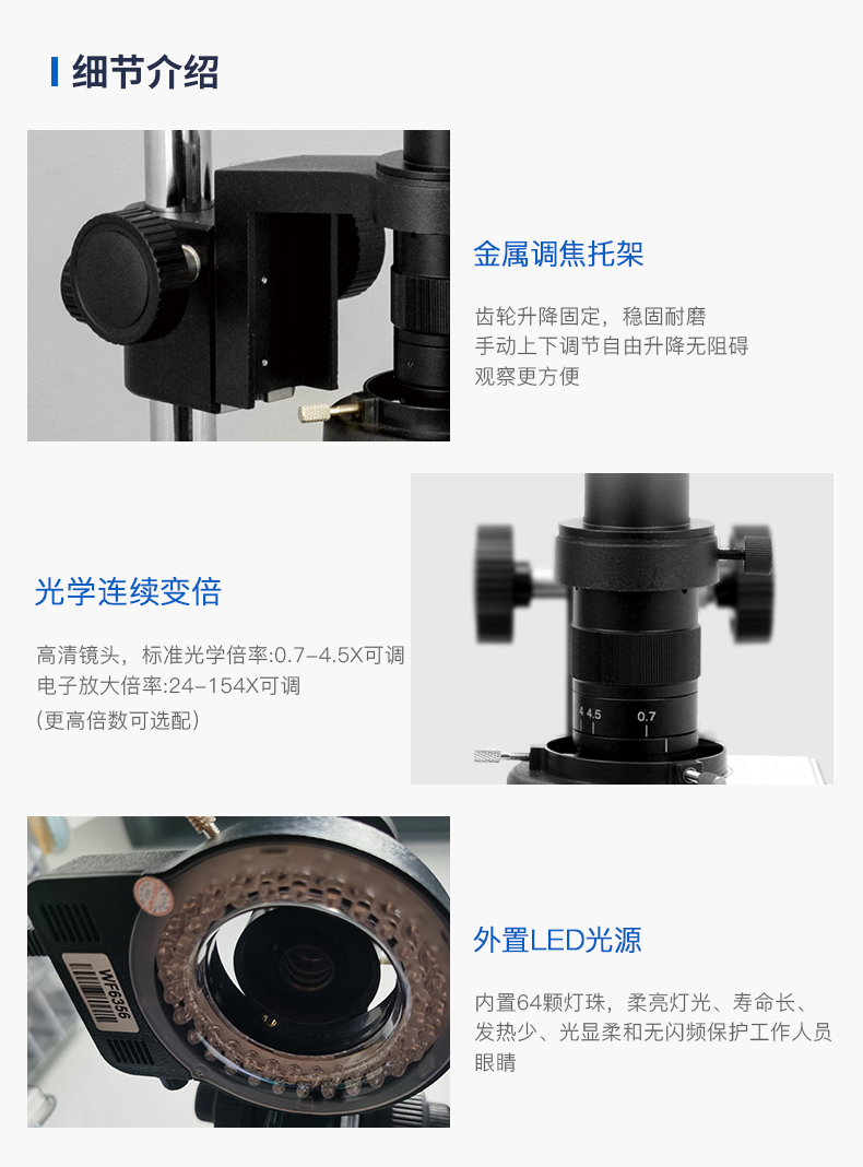 調(diào)焦范圍60mm,可滿足超大工件的觀察,可根據(jù)需求選配6寸或10寸的二維移動平臺。