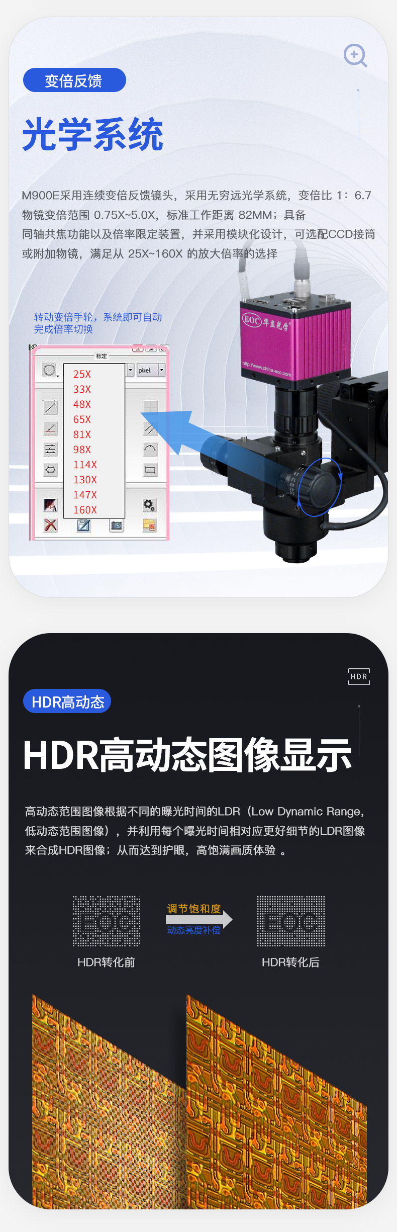 E-900系列視頻顯微鏡采用華顯光學最新研發(fā)的900系列連續(xù)變倍反饋鏡頭,