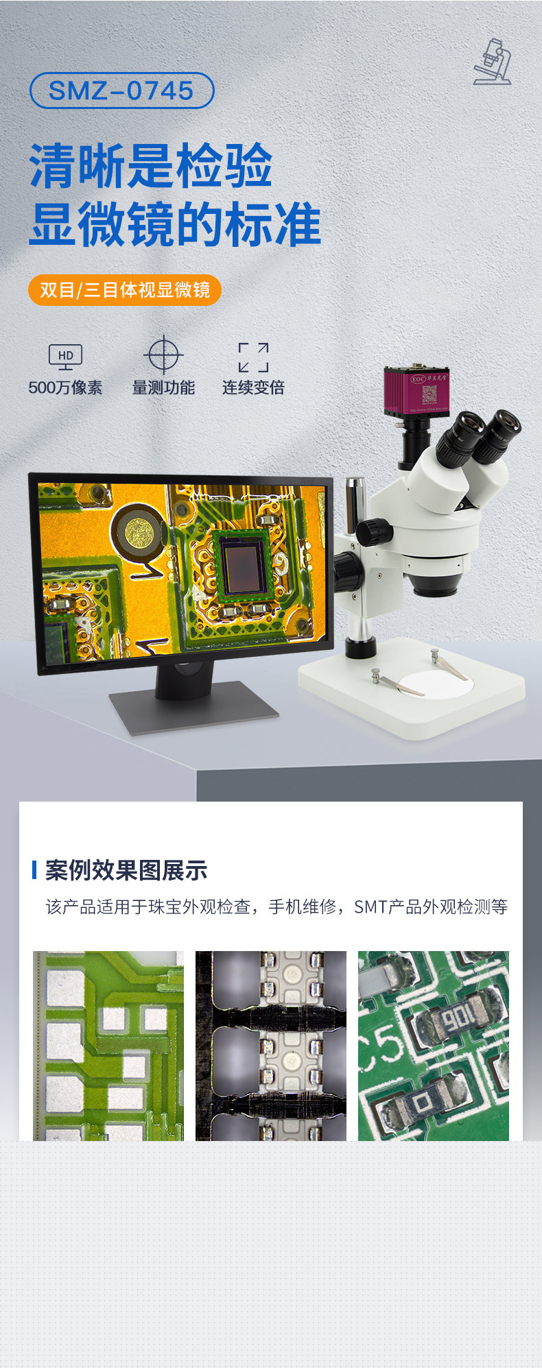用于手機(jī)維修、珠寶鑒定、微觀雕刻、電子元器件外觀檢測、SMT外觀檢測、半導(dǎo)體芯片觀察、