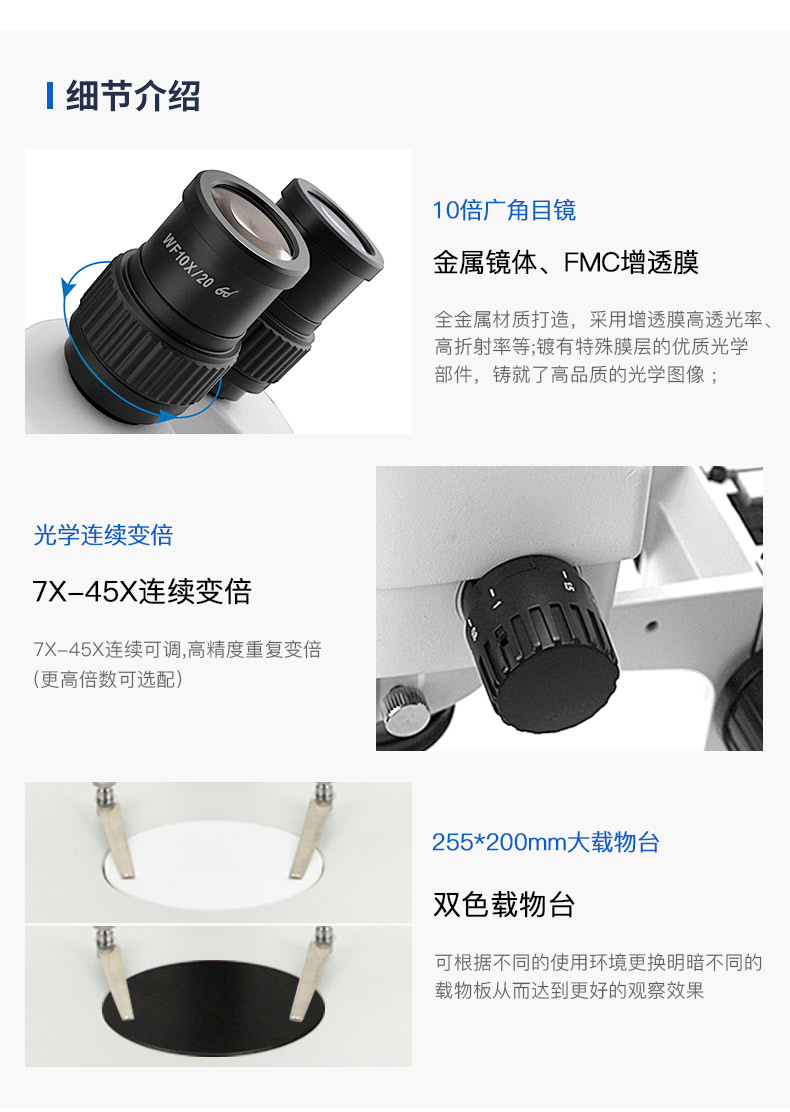 3. 采用連續(xù)變倍物鏡0.7X~4.5X(6.3:1),標(biāo)準(zhǔn)放大倍率7X~45X。