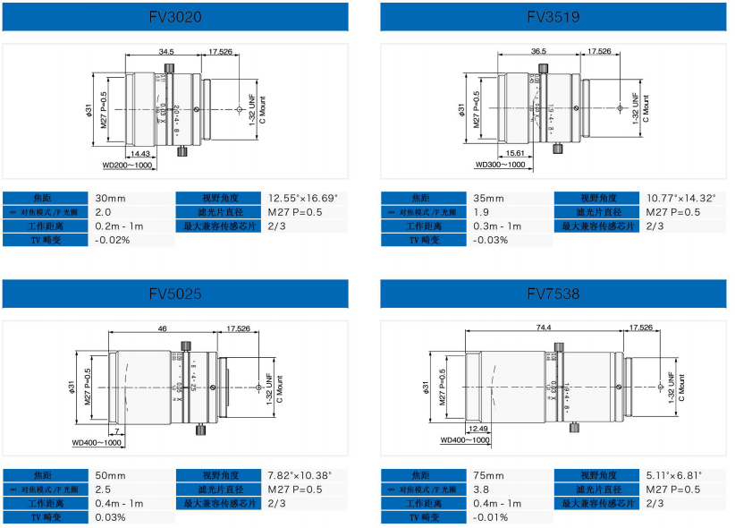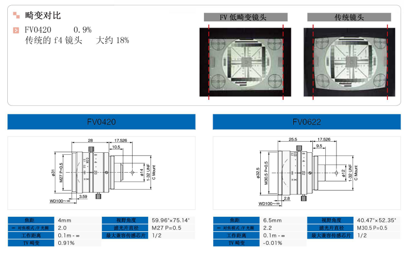 4.TV畸變現(xiàn)象小于0.1%(除了F4mm)