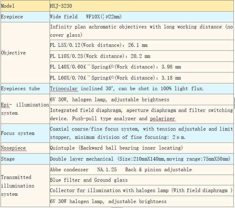 HXJ-3230  reflected and transmitted microscope is suitable to observe surfaces of non-transparent object or transparent object.It is equipped with vertical illuminator, infinity plan achromatic objectives with long working distance (no cover glass), wide-field eyepieces and set polarizer device in trinocular. It provides clear and high-contrast image, beautiful sculpt,convenient control, etc. It is the ideal instruments in research work in biology, Metallurgical, mineralogy,  precision engineering, electronics, etc. It is suitable for scientific research, teaching demonstration in the colleges and factory.
