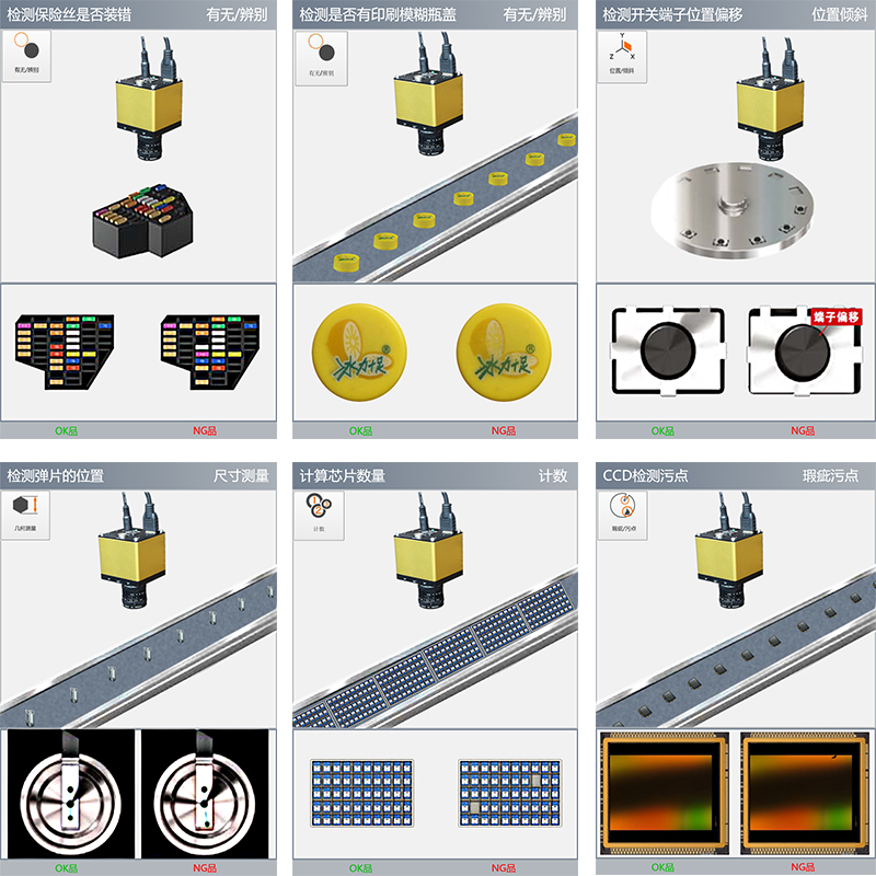 Applications: mobile phone missing detection, line sequence detection, geometric size measurement, defect detection, guide positioning, barcode two-dimensional code recognition, counting statistics, etc.