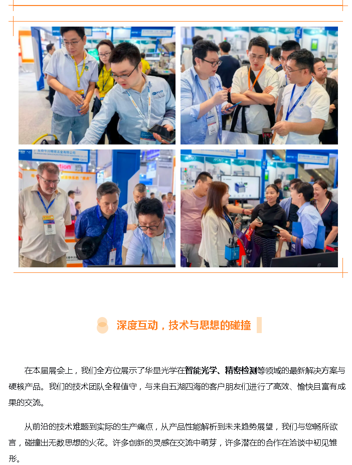 現場技術人員通過實機演示、案例講解,與來訪嘉賓深入探討行業(yè)痛點與技術趨勢。許多客戶對華顯光學產品的高穩(wěn)定性、精準度和智能化功能表示了高度認可,并達成了多項初步合作意向。